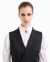 Clean-lined, double-breasted gilet in a silk fabric-stitch knit and defined by ribbed inserts that outline the back and sides. The style, with notched lapels and a special button fastening, expresses the recurring androgynous theme of the collection, lending itself to day-to-night looks teamed with shirts and wide trousers. <br>The garment is part of the Holiday selection, which plays with a minimalist colour palette of black and white, colours that have always been a symbol of sophistication. A colour choice found in the fabrics, embroideries and accessories that express the essence of Armani spirit, distinguished by clean, androgynous-inspired lines, that are still always feminine and sensual. Fineness: 18 Notched lapels Buttoned fastening Rib-knit sides and back Made in Italy Product Code: GW001816AF18794UC001