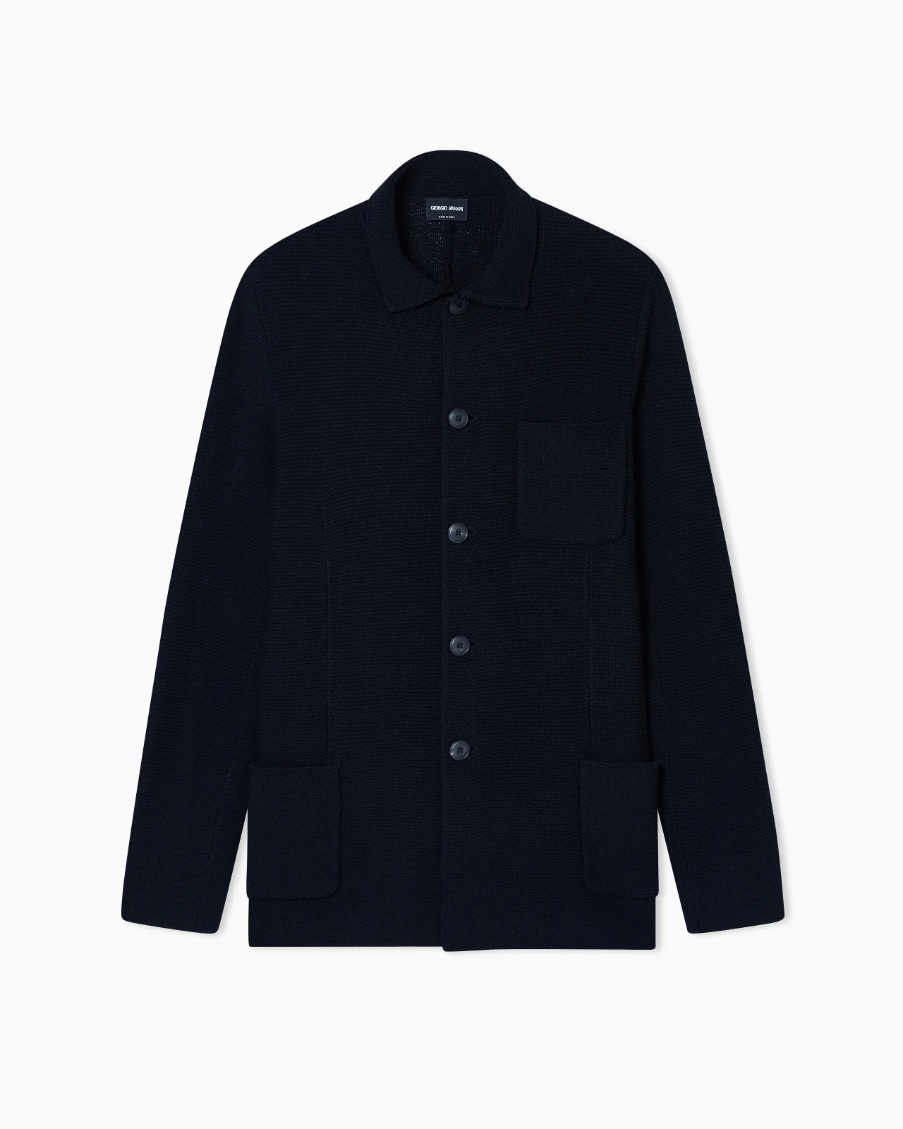 Single-breasted jacket made from a links-stitch cotton knit, which gives the garment a three-dimensional look. The style with essential lines, features a front button fastening and three front patch pockets, ideal for a relaxed and elegant look. The piece is part of the Holiday selection, which plays with an elegant colour palette that offers shades of grey, onyx and notes of blue. Nuances that combine with exquisite fabrics and fluid shapes that express a great sense of modernity in perfect Giorgio Armani style. Fineness: 5 Seamless Collar with small lapels Two patch pockets Breast patch pocket Buttoned, single-breasted closure Unlined Made in Italy Product Code: GM003089AF24512UC001