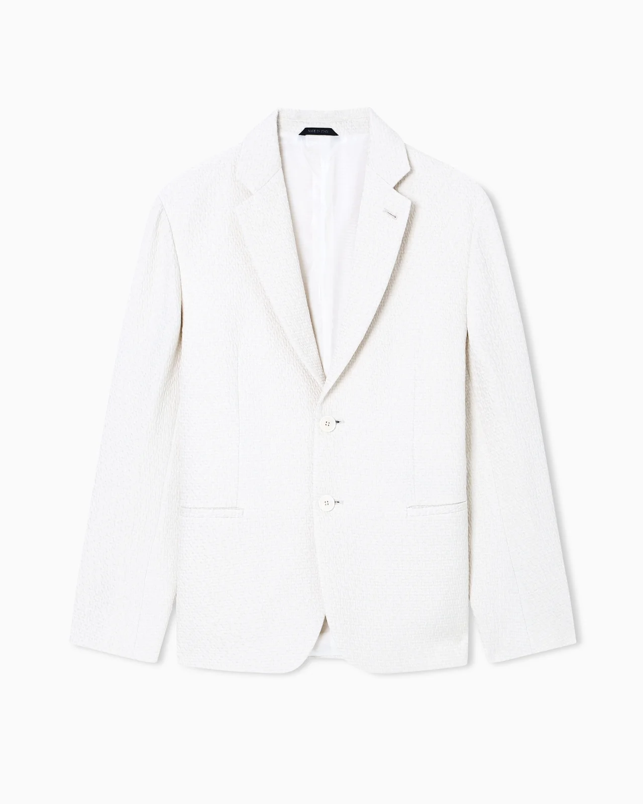 Single-breasted jacket made in a silk blend, with a quilted finish that gives the garment a sophisticated three-dimensional appearance. The style features notched lapels and two welt side pockets. A modern, refined design means that it completes outfits with a touch of sophistication when worn with the collection’s trousers and shirts. Fabric: 24% recycled polyamide; Lining: 94% cupro from recycled cotton by-products Notched lapels One-button single-breasted closure Two front welt pockets Lined garment Length: 73 cm Made in Italy Product Code: GM000003TE20150U1094