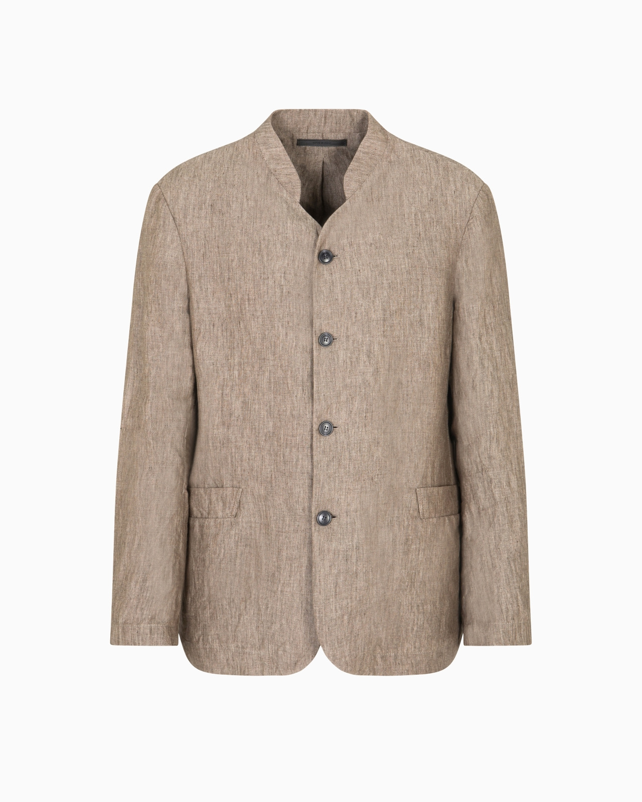 Single-breasted jacket made of faded linen chambray, in a natural, versatile shade. A style that stands out with its guru collar with a V neck, exposed button placket and two front pockets, details that enhance its clean, essential lines. An offering with a fresh attitude, perfect for teaming with the matching trousers, for a look that is both relaxed and refined.<br>The piece is part of the Holiday selection that plays with a striking colour palette, incorporating black onyx, sky blue and ivory. These shades are combined with luxurious fabrics like linen and silk, and iconic ones, like cupro and Lyocell, creating a unique experience in texture. Modern, relaxed shapes dress up different occasions with unmistakable Giorgio Armani style. Single-breasted jacket V-neck guru collar Single-breasted closure with four buttons Two front pockets Buttons at the sleeve hem Central back vent Unlined Length: 72 cm Made in Italy Product Code: GM001742AF17957U6189