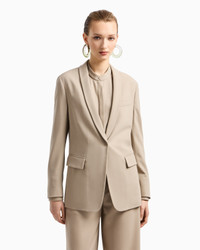 Relaxed-fit, slinky single-breasted jacket made from stretch barathea wool. The style’s details — slightly dropped shoulders, shawl lapels and flap patch pockets — temper its masculine feel. An extremely versatile offering to team with wide-leg trousers and flat shoes for sophisticated looks. Single-breasted jacket Shawl collar Slightly dropped shoulders Two flap pockets Breast welt pocket Small slits at cuffs Centre-back double vent Contrasting internal piping Partially lined Length: 77 cm Made in Italy Product Code: GW000654TE10405U8048