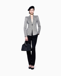 Elegant single-breasted jacket made of viscose jersey, embellished with jacquard with a vertical striped motif that helps emphasise the elongated silhouette. The style is distinguished by its figure-hugging silhouette that elegantly accentuates the waist and a lapel-free neckline. A versatile, refined piece, perfect for completing formal looks or adding a modern touch to more casual outfits. Single-breasted jacket V neckline without lapels One-button single-breasted closure Breast pocket Long sleeves Length: 62 cm Made in Italy Product Code: GW002159AF19847F1010