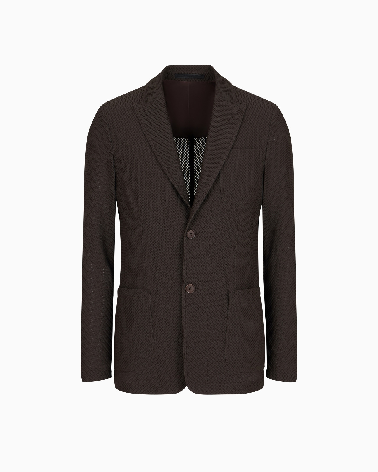 Single-breasted jacket made of technical waffle mesh, with a comfortable fit. It features notched lapels, two side welt pockets and a modern, refined design that will complete daytime outfits with a sophisticated touch teamed with the collection’s trousers and shirts. Product Code: GM000696TE100451U6031 Details Composition 80% Polyamide 20% Elastane Single-breasted jacket Peak lapels Two-buttoned, single-breasted closure Two patch pockets Breast patch pocket Unlined Length: 72 cm Made in Italy Fitting The model is 188 cm tall and is wearing size 48 / M