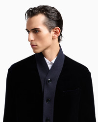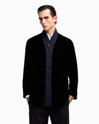 Single-breasted jacket with elongated lines, made of premium velvet from the collection, embellished with a contrasting knit insert that customises the neckline and placket. The style features a five-button closure and small welt pockets, one at the chest and two at the sides, and is distinguished by its clean yet sophisticated silhouette. An offering with an elegant, modern style, designed for eveningwear looks. Single-breasted jacket in velvet Slightly stand collar with V neckline Contrasting knit insert at the collar and placket Five-button, single-breasted closure Breast welt pocket Two small welt pockets Buttoned cuffs Lined Length: 78 cm Made in Italy Product Code: GM002544TE10046UB109