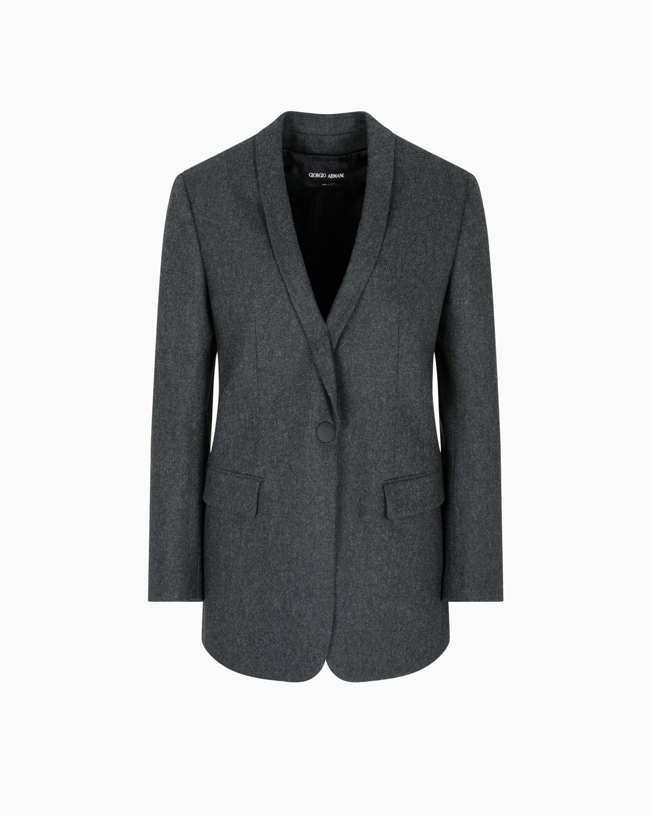 Single-breasted jacket made of cosy wool and cashmere flannel, with an elegant, minimalist silhouette. The style features a covered button closure, two flap pockets and shawl lapels. A versatile, sophisticated offering, designed for completing a wide array of looks, perfect teamed with the matching trousers. Single-breasted jacket Shawl collar Single-breasted closure with one covered button Two front flap pockets Side slits Cuffs with slits Lined Length: 72 cm Made in Italy Product Code: GW001951TE10537U8131