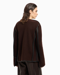 Single-breasted jacket made of wool and cashmere fleece, embellished with contrasting edges in supple leather that elegantly define the silhouette. Distinguished by its round, lapel-free neckline and front button closure, the style features slightly fitted lines and leather-trimmed patch pockets. A versatile, sophisticated offering designed to feature in a wide array of looks. Single-breasted jacket Round neckline without lapels Two-buttoned, single-breasted closure Two patch pockets Leather trims and inserts Length: 66 cm Made in Italy Product Code: GW001532AF12460U8130