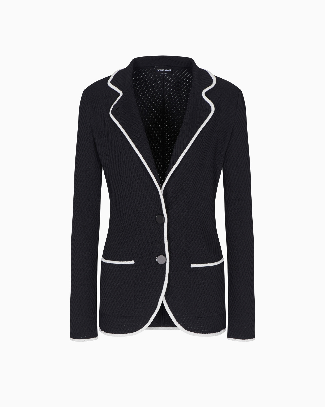 Single-breasted jacket made of lightweight silk jersey, featuring jacquard that creates a monochromatic diagonal movement that gives the piece a three-dimensional appearance. Defined by notched lapels, a single-breasted two-button closure and patch pockets, it is embellished with contrasting piping that highlights its clean androgynous lines. <br>The garment is part of the Holiday selection, which plays with a minimalist colour palette of black and white, colours that have always been a symbol of sophistication. A colour choice found in the fabrics, embroideries and accessories that express the essence of Armani spirit, distinguished by clean, androgynous-inspired lines, that are still always feminine and sensual. Fineness: 14 Single-breasted jacket Notched lapels Two-buttoned, single-breasted closure Two patch pockets Contrasting piping Unlined Made in Italy Product Code: GW001812AF18782FC001