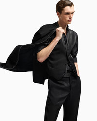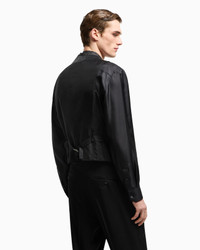 Elegant and sophisticated single-breasted waistcoat made of a viscose blend with smooth feel, lit up by a luxurious insert at the neckline covered all-over with monochromatic rhinestones.<br>The piece is part of the exclusive collection that celebrates the connection between Giorgio Armani and the world of Hollywood. A colour palette of deep blues combines with a profound and ever-elegant black, to create a sparkling, luxurious selection inspired by the limelight and most exclusive Hollywood parties. Extremely sophisticated pieces with iconic lines are made of velvets, silks and satins enlivened by crystal and rhinestone embellishments and refined workmanship. Looks for him and her, designed for evenings and special occasions. V neck Matching rhinestone-covered insert Single-breasted closure with four covered buttons Two front welt pockets Adjustable back with strap Lined Length: 56.5 cm Made in Italy Product Code: GM001732TE15960MC023