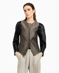 Single-breasted waistcoat made of silk and wool in an opulent jacquard with an irregular geometric motif adding movement. The style features an essential construction, with a round neckline, five-button closure, welt pockets and a matching satin back. A perfect offering to pair with a collection shirt or to wear on its own, as a top, with the matching trousers for a sophisticated total look. The piece is part of the New Normal selection, an offering that reinterprets the brand’s archive looks with a modern twist. Pieces in elongated and fluid shapes and with an androgynous flavour dress the feminine silhouette with elegance for day-to-night looks. This season it comes in a natural colour palette animated by a series of chevron motif and houndstooth shapes, a clear reinterpretation of pieces "stolen" from the male wardrobe with a feminine twist. Crew neck Five-button, single-breasted closure Two welt pockets Satin back Lined Made in Italy Product Code: GW001588TE16797MC023