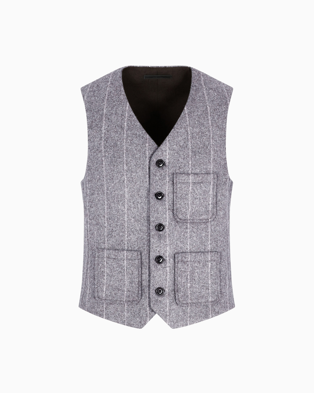 Single-breasted waistcoat made of warm and comfortable alpaca-blend cloth embellished with a pinstriped motif that adds depth. The style is defined by a button closure and three small patch pockets. A versatile offering, perfect for completing informal looks with a sophisticated touch. V neck Five-button, single-breasted closure Two patch pockets Breast patch pocket Lined Length: 57 cm Made in Italy Product Code: GM002255TE17626O6008