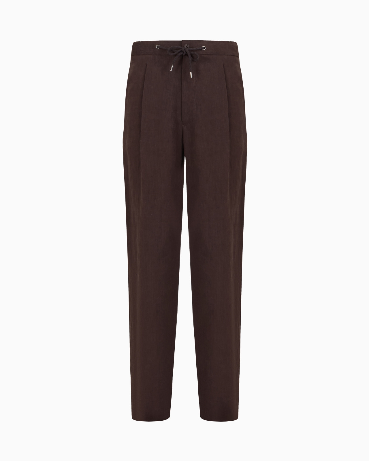 Single-pleat trousers made from crisp, lightweight pure linen canvas, featuring a comfortable fit accentuated by the drawstring waist. A style with versatile lines, perfect for creating modern daytime or evening looks. Product Code: 4SGPP154T040K1U63N Details Composition 100% Linen Single pleat Drawstring waistband Button and zip closure Two side welt pockets Cuff width: 19 cm Made in Italy Fitting The model is 188 cm tall and is wearing size 48/M