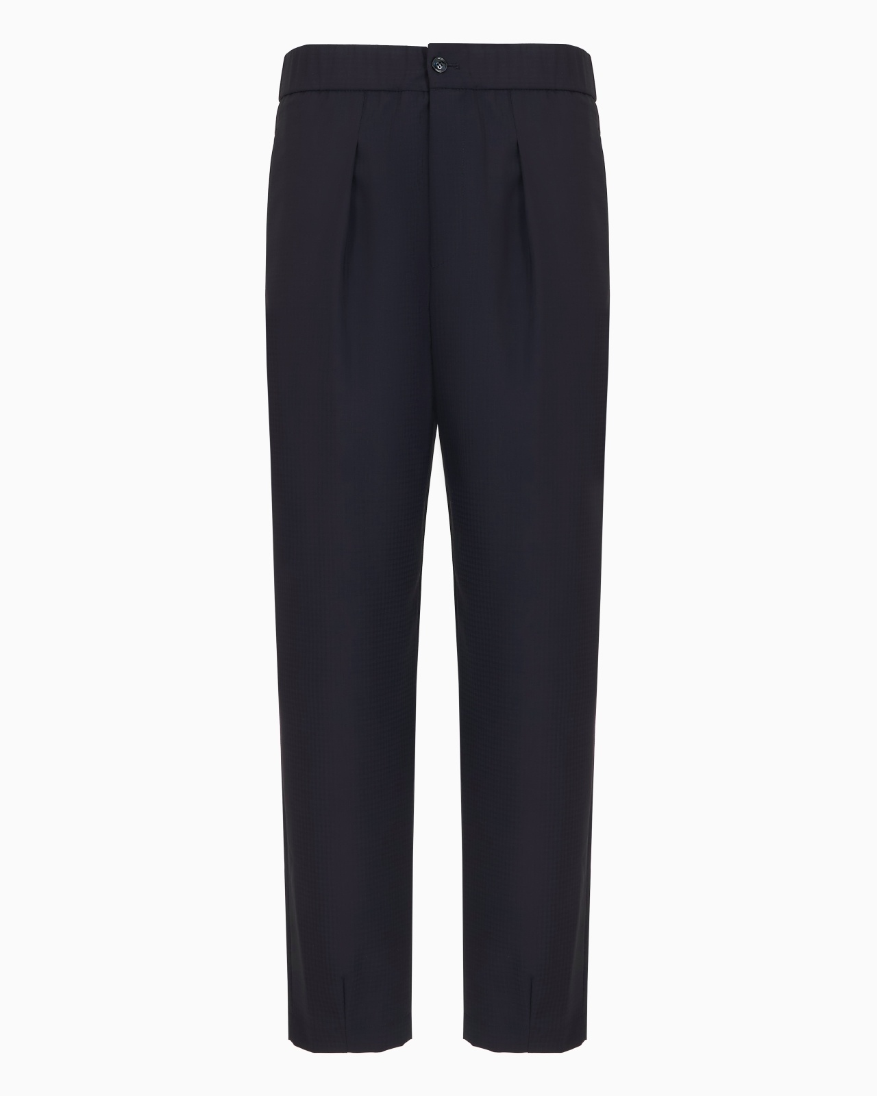 Trousers made of pure virgin wool canvas with an elasticated waist. With a single front pleat, side welt pockets and a button-and-zip fastening, the style stands out for its relaxed, fresh attitude: perfect for pairing with the collection's shirts and T-shirts in an endless variety of looks. Single-pleat trousers Elasticated waist Button and zip closure Two side welt pockets Two back pockets Cuff width: 19 cm Made in Italy Product Code: GM000576TE14603U8138