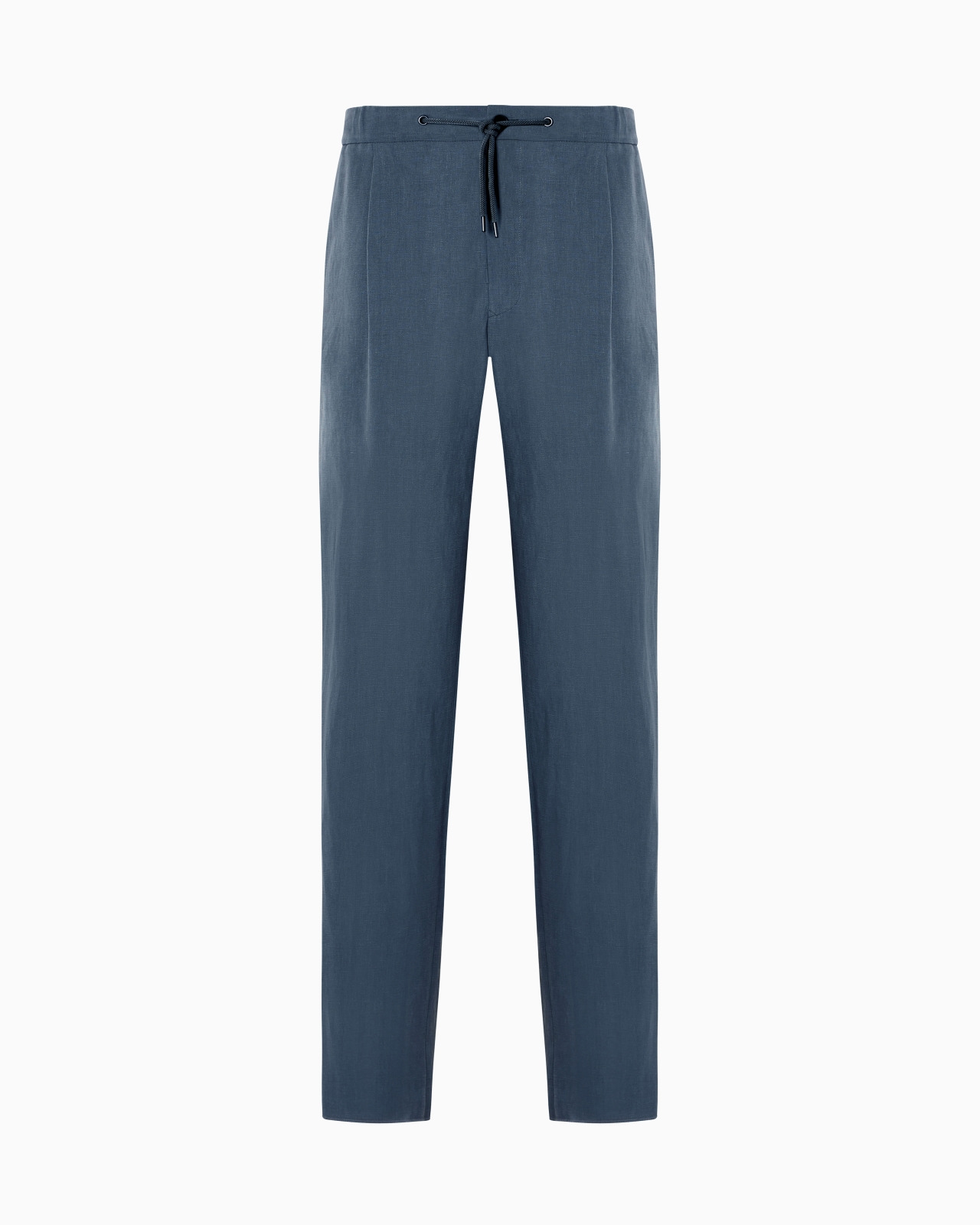 Single-pleat trousers made of smooth linen canvas, with a comfortable, fresh feel. Featuring a drawstring detail at the waist, which ensures exceptional comfort for the wearer, the style features side pockets and a button and zip fastening. A relaxed and versatile offering that can be paired with deconstructed jackets and shirts. Single-pleat trousers Drawstring waistband Button and zip closure Two side welt pockets Two back welt pockets <b>Hem width: 19 cm Made in Italy Product Code: GM001625TE10954U8167