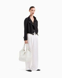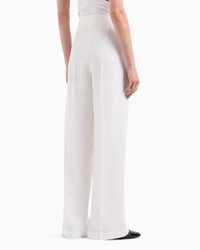 Single-pleat wide-leg trousers made of silk crepe cady in black and white and featuring a slinky, relaxed fit. This style is given a twist with two buttons on the front, highlighting the waist. A clean and essential day-to-night offering, perfect with tops and jackets from the collection.<br>The garment is part of the Holiday selection, which plays with a minimalist colour palette of black and white, colours that have always been a symbol of sophistication. A colour choice found in the fabrics, embroideries and accessories that express the essence of Armani spirit, distinguished by clean, androgynous-inspired lines, that are still always feminine and sensual. Trousers with front crease Waistband with two special buttons Side zip closure Two side slant pockets Unlined Length: 115 cm Made in Italy Product Code: GW001562TE16469U0002