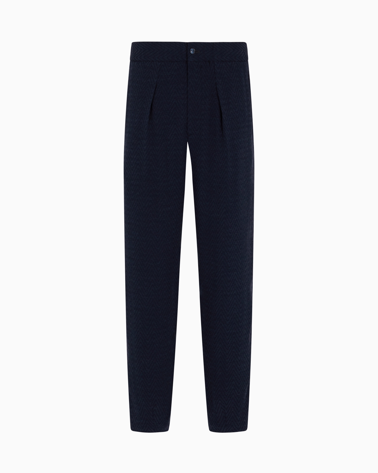 Trousers made of cupro and viscose embellished with a monochromatic chevron jacquard motif. With a single front pleat, side welt pockets and a button-and-zip fastening, the style stands out for its relaxed, fresh attitude: perfect for pairing with the collection's shirts and T-shirts in an endless variety of looks. Single-pleat trousers Elasticated waist Button and zip closure Two side welt pockets Two back pockets Cuff width: 19 cm Made in Italy Product Code: GM000576TE14380UB114
