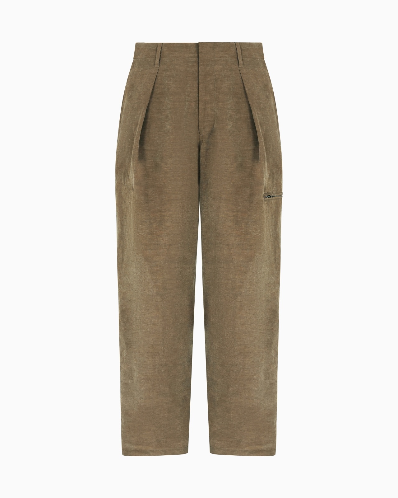 Single-pleat trousers made from Lyocell and linen, available in the collection's colour palette. With a waistband with belt loops, button and zip closure and side pockets, the style is distinguished by an extremely smooth, silky feel that ensures a comfortable fit and side zip pocket detail that adds a rugged touch to the item. A piece with a modern, relaxed cut, the perfect match for a multitude of looks. Single-pleat trousers Waistband with belt loops Zip-and-hook closure Two side pockets Two zipped side pockets Two back welt pockets Cuff width: 21 cm Made in Italy Product Code: GM001394TE14273U6254