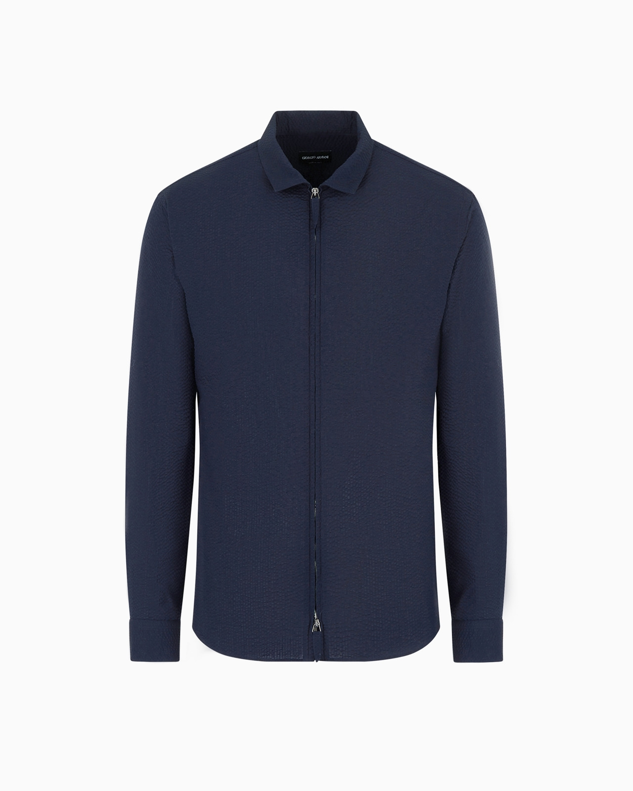 This slim-fit, cotton-seersucker shirt adds a unique touch to a wide array of outfits. Its linear design is enhanced by a front zip closure, emphasising its modern spirit. Product Code: GM000057TE111861UB115 Details Composition 100% Cotton Slim fit Collar with small points Front zip closure Press-stud cuffs with sleeve placket French seams Back darts Back yoke Made in Italy Fitting The model is 188 cm tall and is wearing size 40