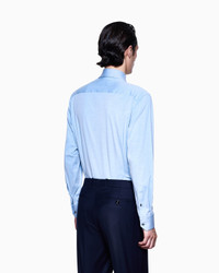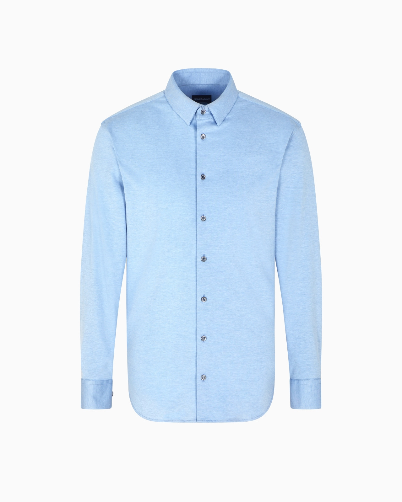 Shirt made from melange cotton-blend jersey in a delicate light blue. It is defined by a slim fit, back darts, mother-of-pearl buttons and a small collar leaf with metal stays, making it perfect with formal attire. Shirt with small pointed collar with metal stays Long sleeves Mother-of-pearl logo button closure Back darts Back yoke Made in Italy Product Code: GM000056TE13848U9315