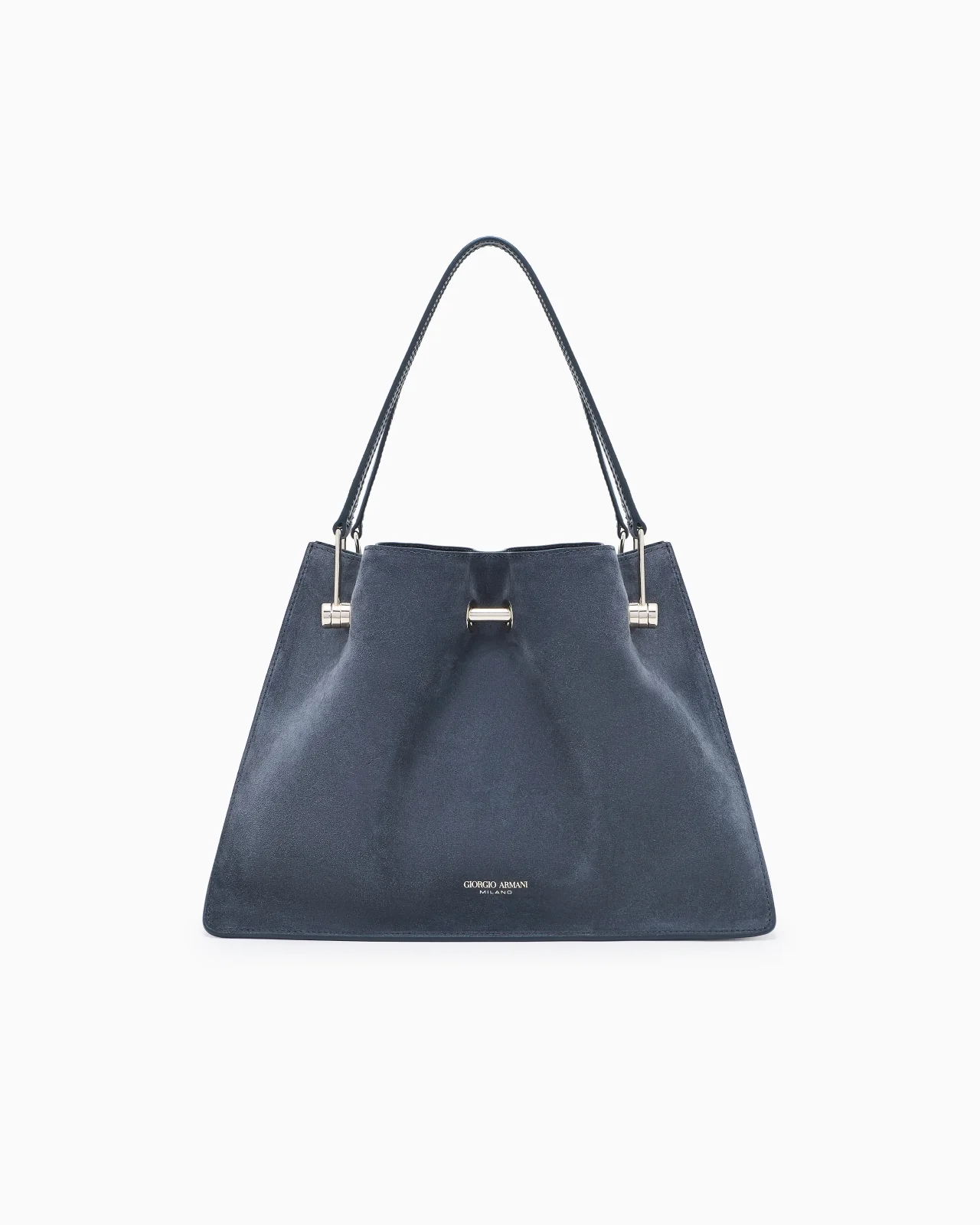 A heritage-inspired piece that recalls some of the brand’s hallmark styles, such as clean lines and a relaxed, deconstructed attitude. Made of suede, it features an internal press stud fastening and gold-tone metal bar detail that retains the leather handles, creating a subtle gathered effect. A exceptionally sophisticated luxurious accessory, perfect for daytime use. Press-stud closure Two leather handles Gold-metal bar detail Heat-stamped Giorgio Armani logo on the bag’s front panel Interior pocket with zip One internal patch pocket Measurements: 21 x 31 x 14 cm Made in Italy Product Code: GW000836AF14186U8070