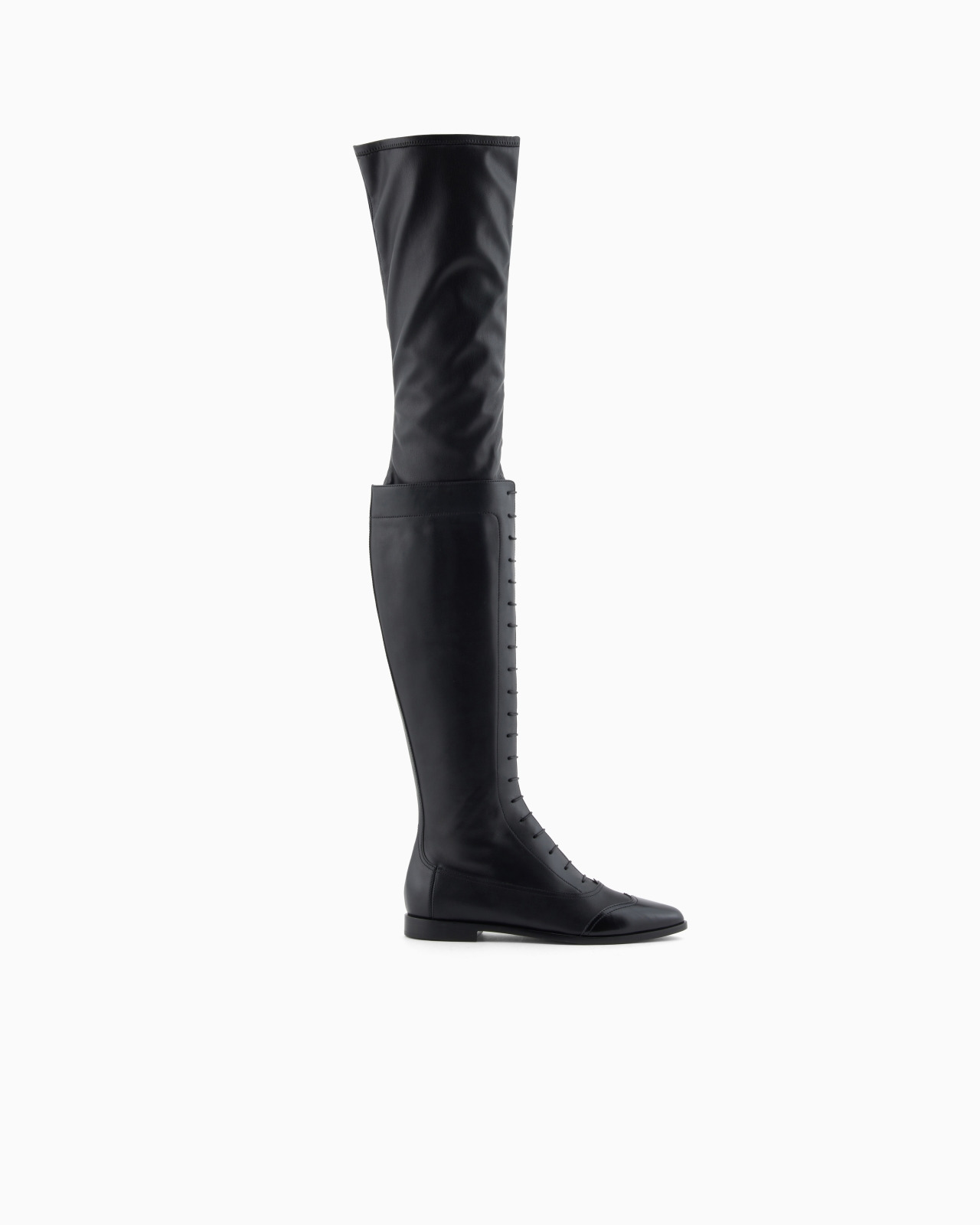 High boots made of supple, smooth calfskin, featuring a tapered toe, adjustable wax lace-up fastening and a practical side zip. This style is distinguished by its unique shaft made of stretch nappa leather that extends above the knee. Perfect for teaming with daywear skirts and dresses, this piece reinterprets an archive style in a sophisticated, on-trend key. Waxed lace fastening Side zip closure for putting on and taking off easily Stretch nappa-leather leg Monobloc leather sole with non-slip inserts Made in Italy Product Code: GW001515AF19137MC153
