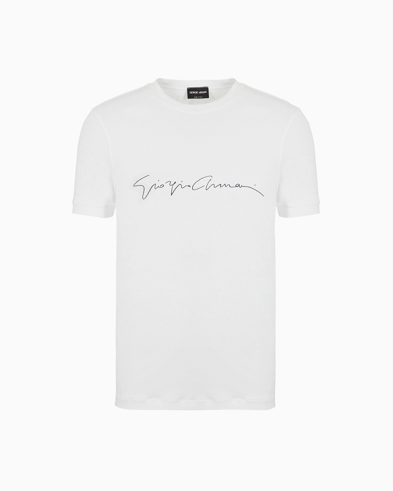 The T-shirt acquires new character: more sophisticated and special. Made from mercerised viscose jersey, this item features an exclusive Giorgio Armani print. Slim fit Crew neck Short sleeves Contrasting signature logo water-transfer print on the front Made in Italy Product Code: 6GST56SJP4ZU090