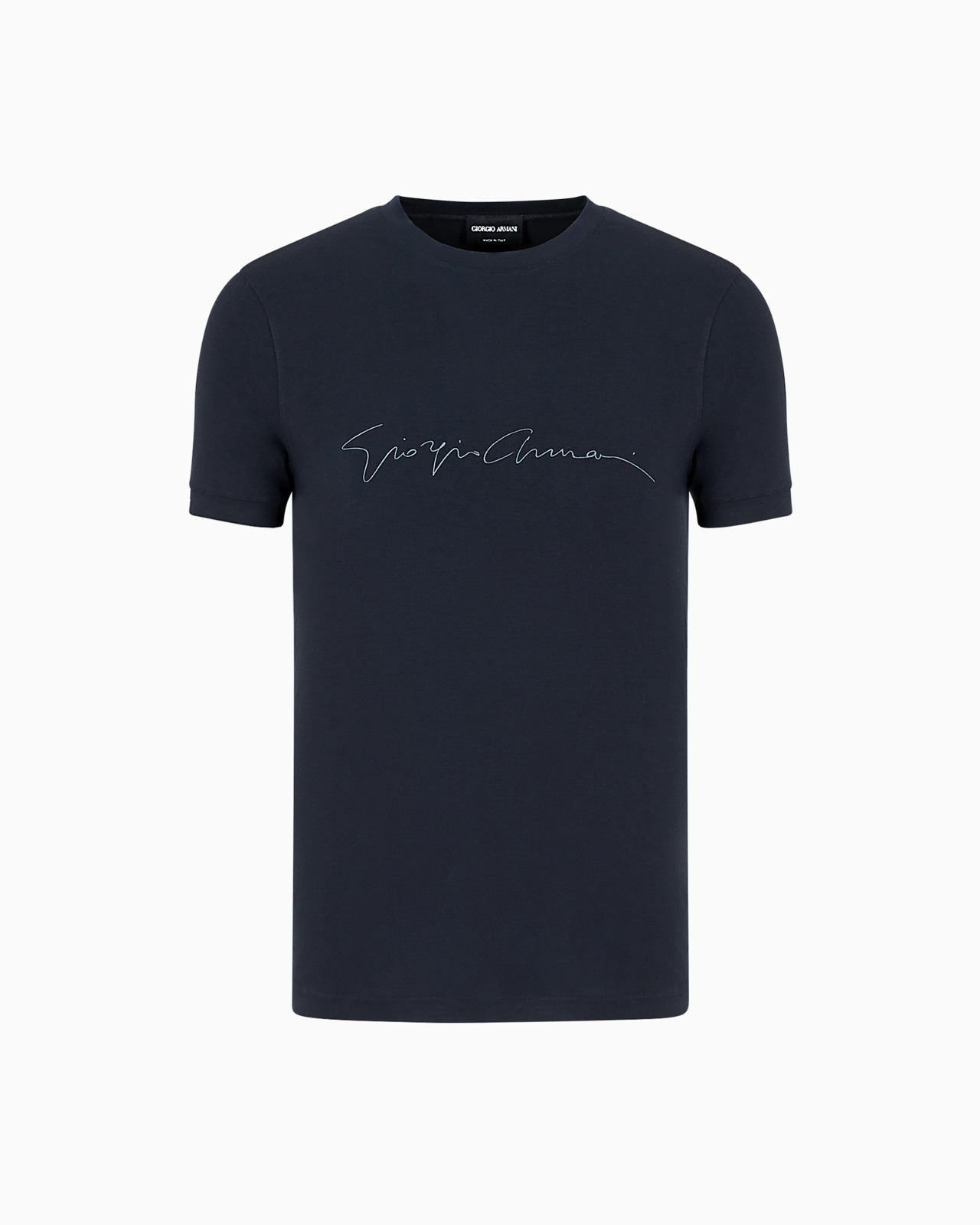 The T-shirt acquires new character: more sophisticated and special. Made from mercerised viscose jersey, this item features an exclusive Giorgio Armani print. Slim fit Crew neck Short sleeves Contrasting signature logo water-transfer print on the front Made in Italy Product Code: 6GST56SJP4ZUBSG