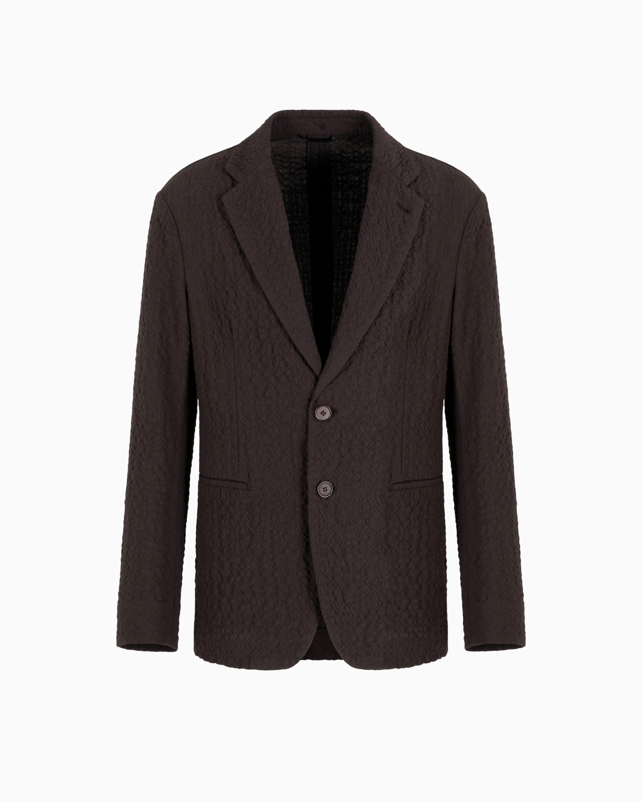 Unlined single-breasted jacket in a comfortable and lightweight fit, thanks to the essential construction. The style, with notched lapels and welt pockets, is made of stretch virgin wool with a distinctive cloque weave, which gives the piece a three-dimensional effect and structure. An offering with a refined, extremely versatile style, perfect for accompanying different looks. Single-breasted jacket Notched lapels Two-buttoned, single-breasted closure Two welt pockets Unlined Length: 73 cm Made in Italy Product Code: GM001517TE13955U6032