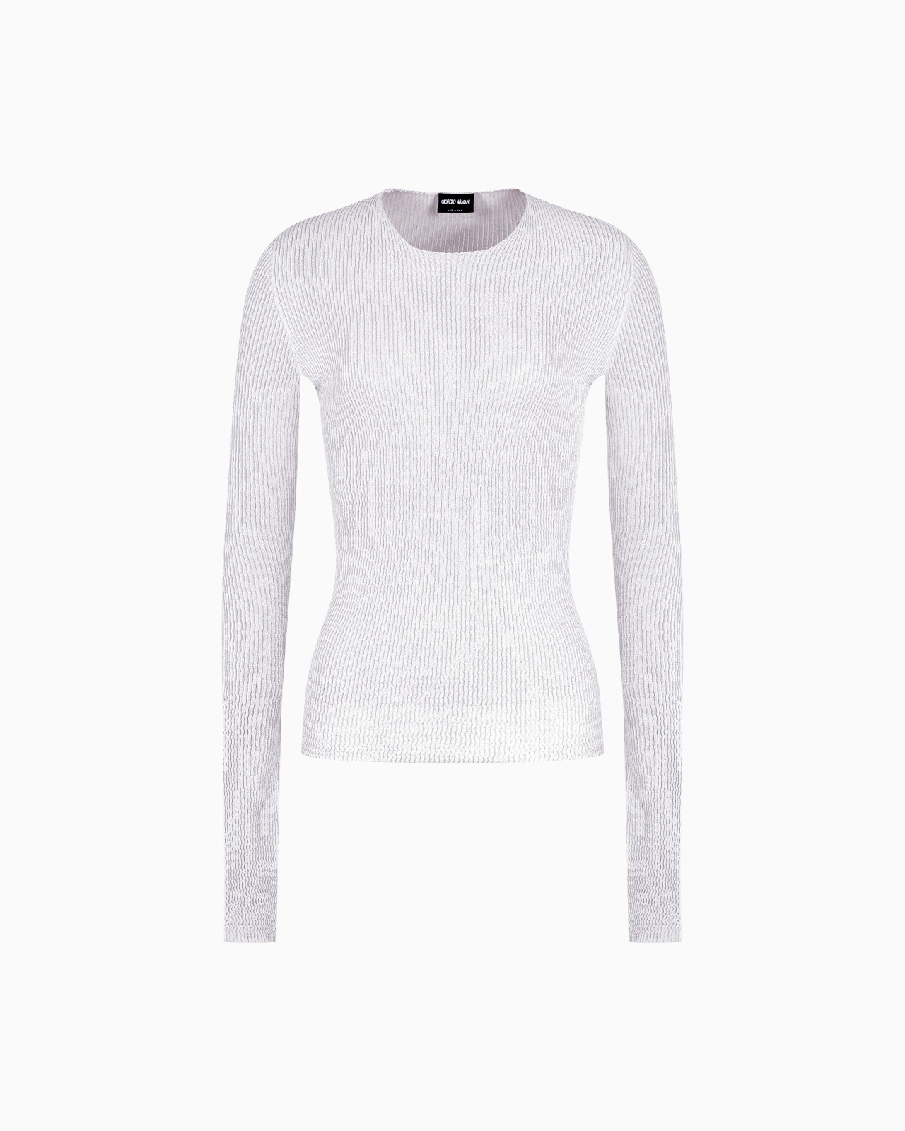 Minimalist, clean lines for this cosy jumper made from a stretch viscose blend, available in the collection colour palette. The round-neck, long-sleeved style features a vertical ruffle motif that creates a slightly three-dimensional effect. A versatile, ideal complement to many looks. Fineness: 18 Rounded neckline Long sleeves Vertical ruffle construction Made in Italy Product Code: GW001205AF15655U8003