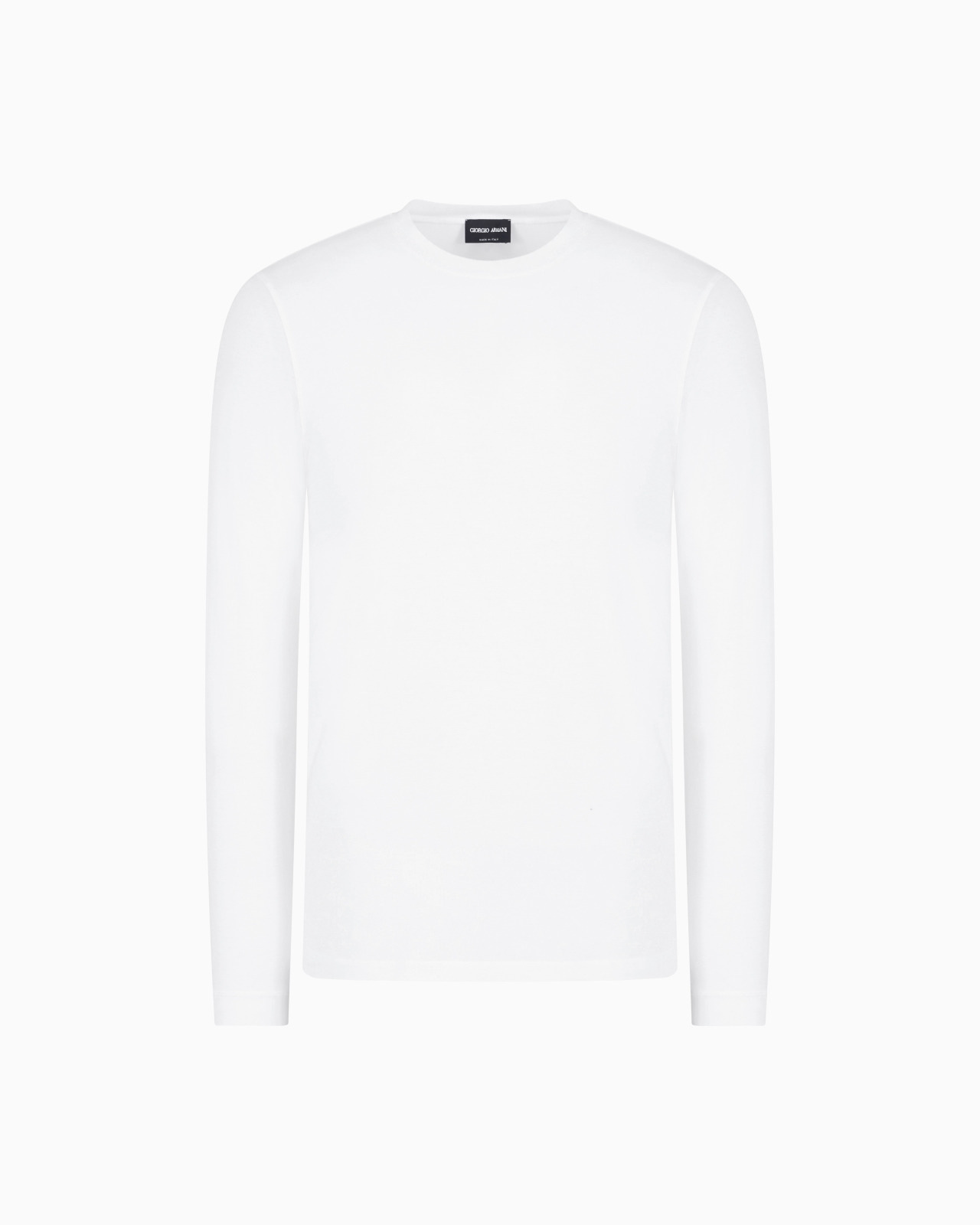Long-sleeved crew-neck jumper made from stretch-viscose bamboo jersey, an iconic fabric of the brand that stands out for its cosy, comfortable feel and perfect fit. Personally chosen and worn by Giorgio Armani as the perfect complement to numerous looks, a hallmark garment of a sleek and highly versatile elegance. Product Code: 3GST51SJP4Z1U090 Details Composition 90% Viscose 10% Elastane Crew neck Long sleeves Rolled, lapped-seam collar and cuffs Made in Italy Fitting The model is 188 cm tall and is wearing size 48 / M