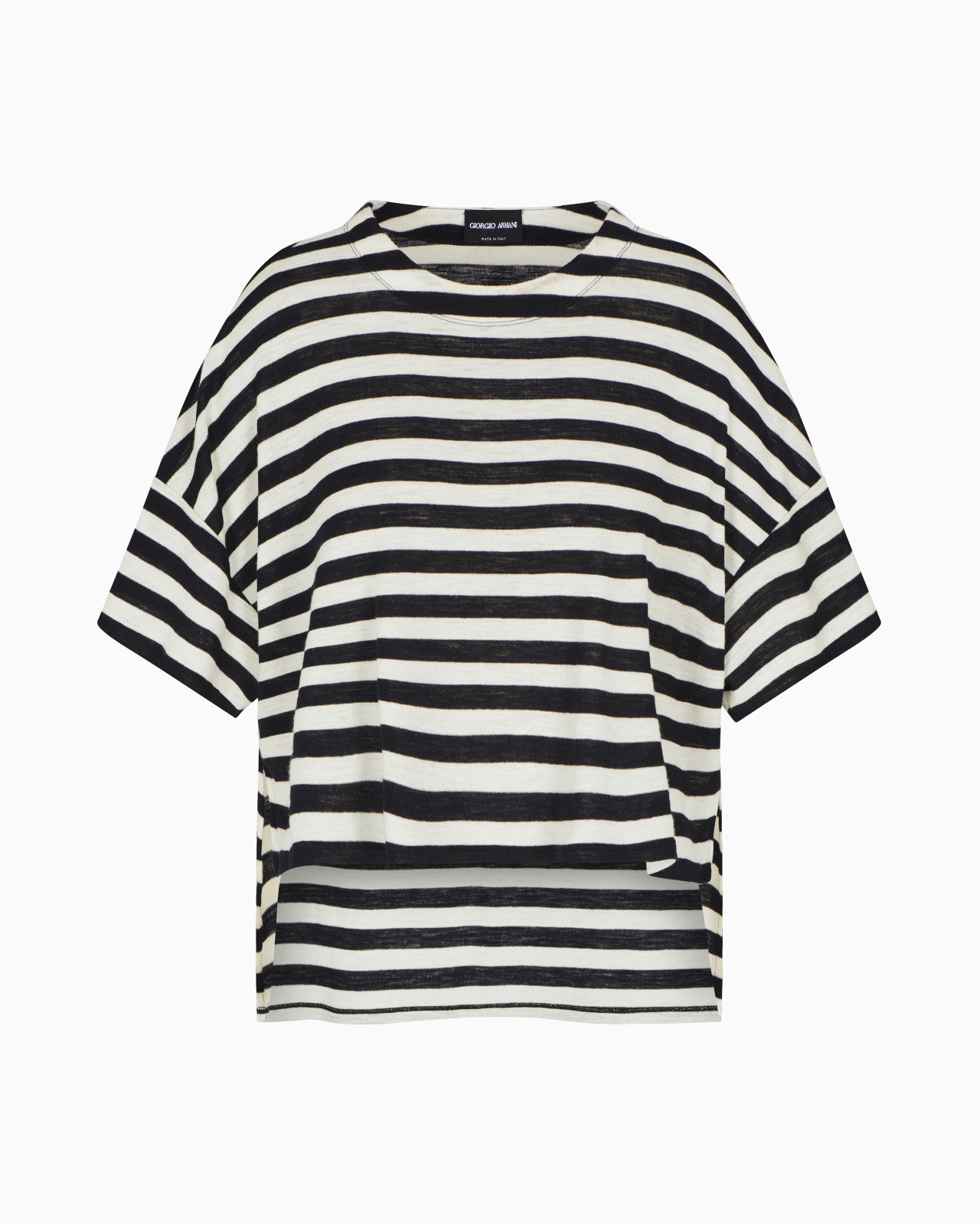 Crew-neck T-shirt made of virgin wool, with cropped volumes and asymmetry between the front and back. The style is animated by the black and white horizontal striped motif, which echoes the hallmark colour palette of this part of the collection. A laid-back offering, perfect for effortless off-duty looks.<br>The garment is part of the Holiday selection, which plays with a minimalist colour palette of black and white, colours that have always been a symbol of sophistication. A colour choice found in the fabrics, embroideries and accessories that express the essence of Armani spirit, distinguished by clean, androgynous-inspired lines, that are still always feminine and sensual. Crew neck Short sleeves Front and back asymmetry Side slits Made in Italy Product Code: GW002354AF19803FC030