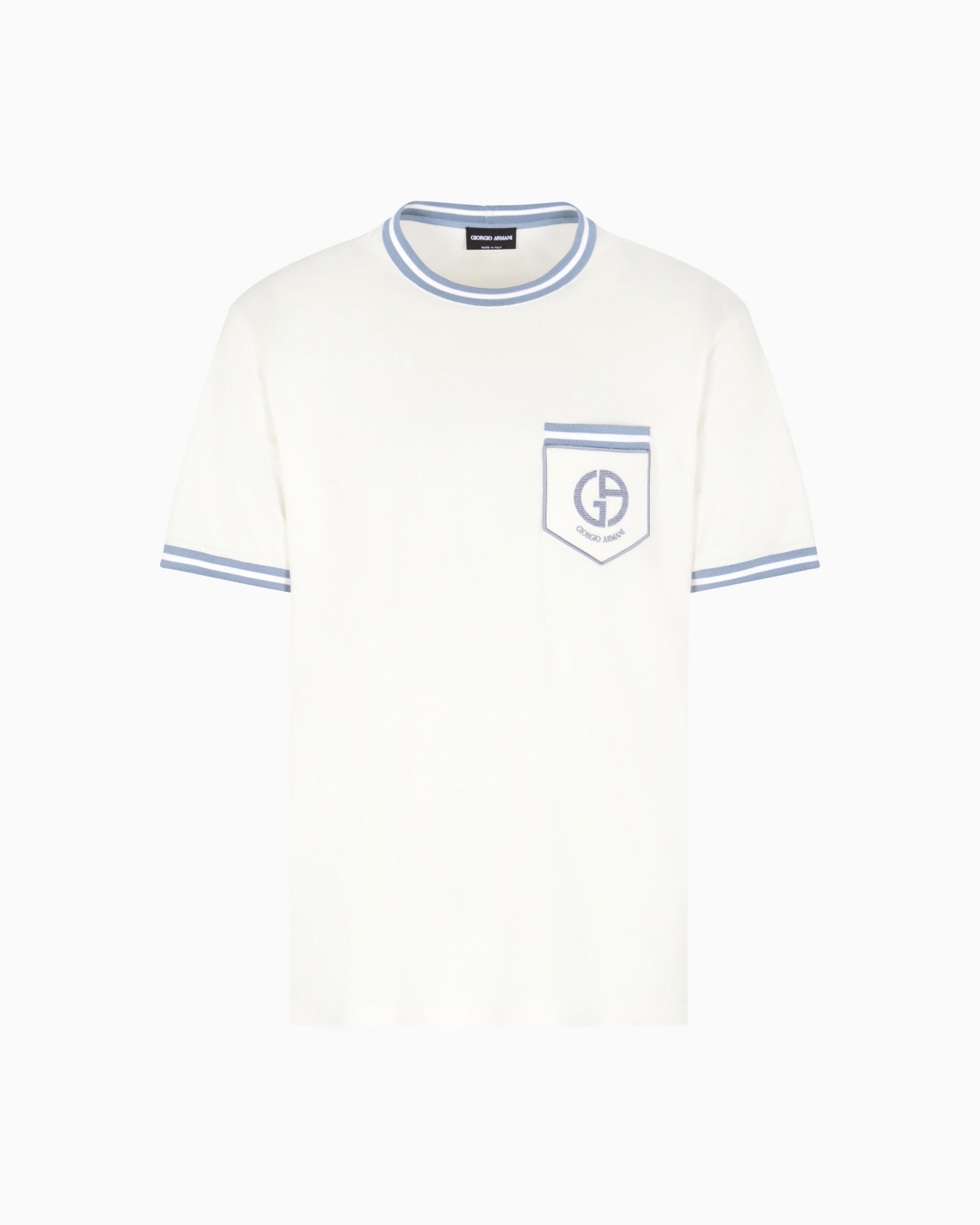 Short-sleeved T-shirt made from pure silk pique jersey that feels soft and is extremely comfortable to wear. The modern style with a relaxed allure features a round collar and is customised with a contrasting embroidered GA logo on the small pocket and details finished with a contrasting viscose trim. <br>The piece is part of the Holiday selection that plays with a striking colour palette, incorporating black onyx, sky blue and ivory. These shades are combined with luxurious fabrics like linen and silk, and iconic ones, like cupro and Lyocell, creating a unique experience in texture. Modern, relaxed shapes dress up different occasions with unmistakable Giorgio Armani style. Crew neck Short sleeves Breast patch pocket with contrasting, embroidered GA logo Contrasting viscose details on collar, armholes and pocket Made in Italy Product Code: GM001939TE15967U0009