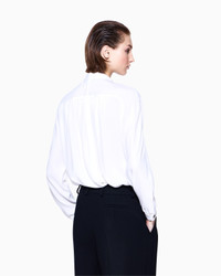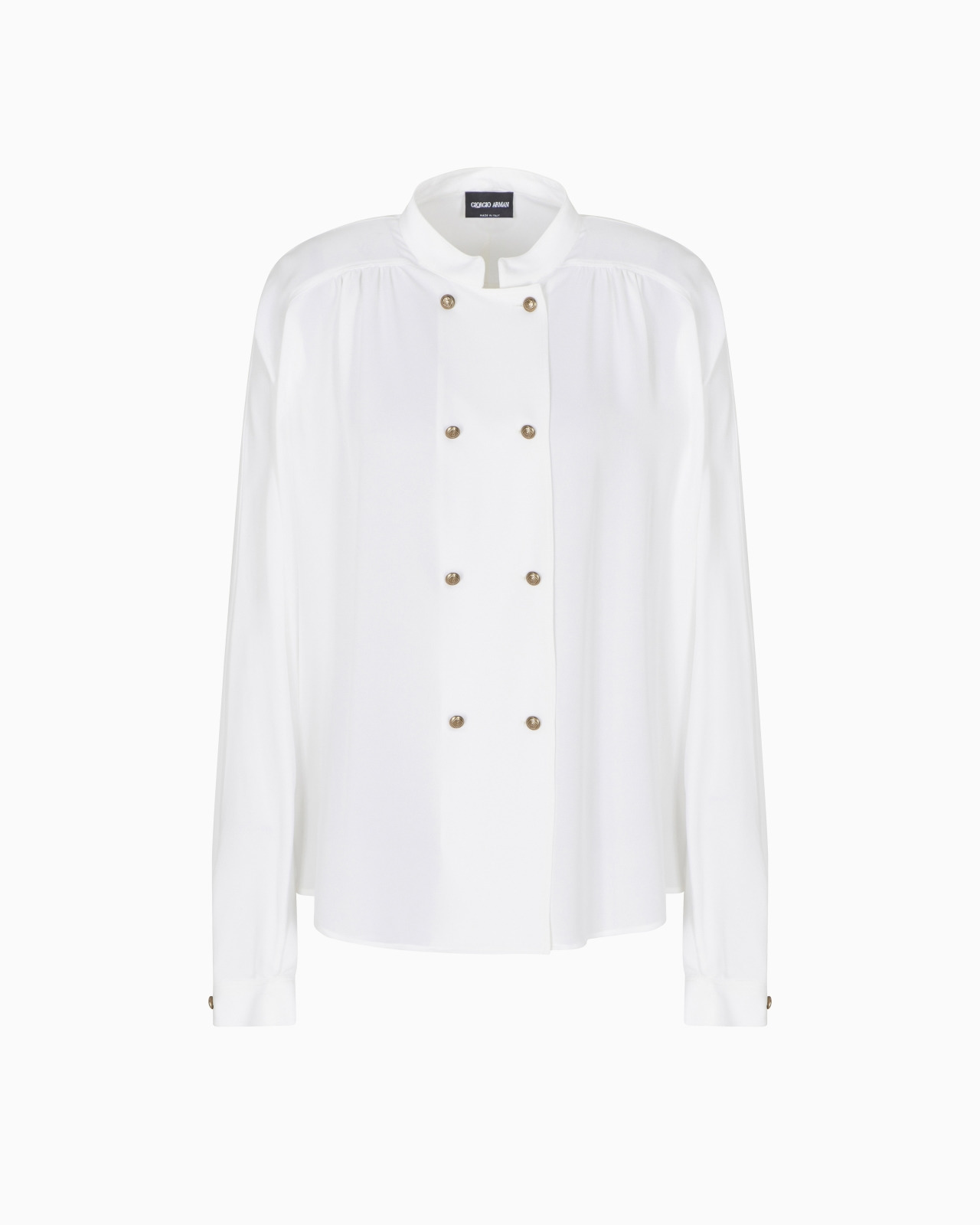 Sophisticated shirt made of triple silk georgette, a flowing fabric that is light as a feather, with a slightly textured feel that caresses the skin. The style is distinguished by its relaxed, flowing silhouette, defined by a guru collar and double-breasted closure with exposed metal buttons. A modern interpretation of a classic piece, perfect for completing daytime looks with a sophisticated touch. Guru collar Long sleeves Gathering detail on the shoulders Double-breasted closure with eight buttons Single-buttoned cuffs Contoured back yoke Made in Italy Product Code: GW001763TE10814U1144
