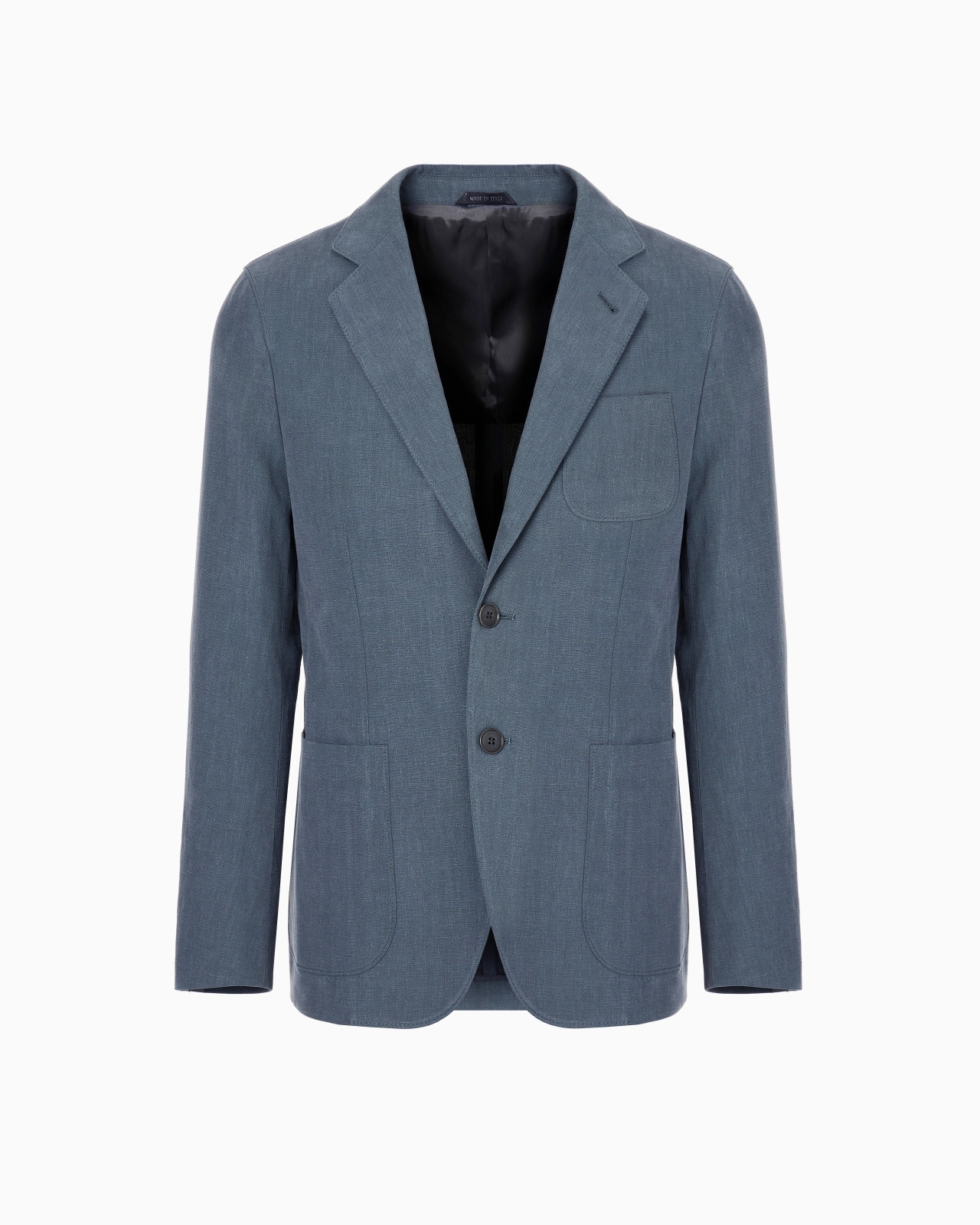 Single-breasted jacket from the Upton Line with a streamlined, completely deconstructed fit: a characteristic that gives the style the iconic fluid lines that are so representative of Giorgio Armani style. This two-button style is made from linen canvas that is lightweight and fresh, and features notched lapels, patch pockets and a breast pocket. Upton Line jacket Notched lapels Two-buttoned, single-breasted closure Two patch pockets Breast patch pocket Button cuffs Two small internal buttoned pockets Unlined Length: 73 cm Made in Italy Product Code: GM000140TE10954U8167