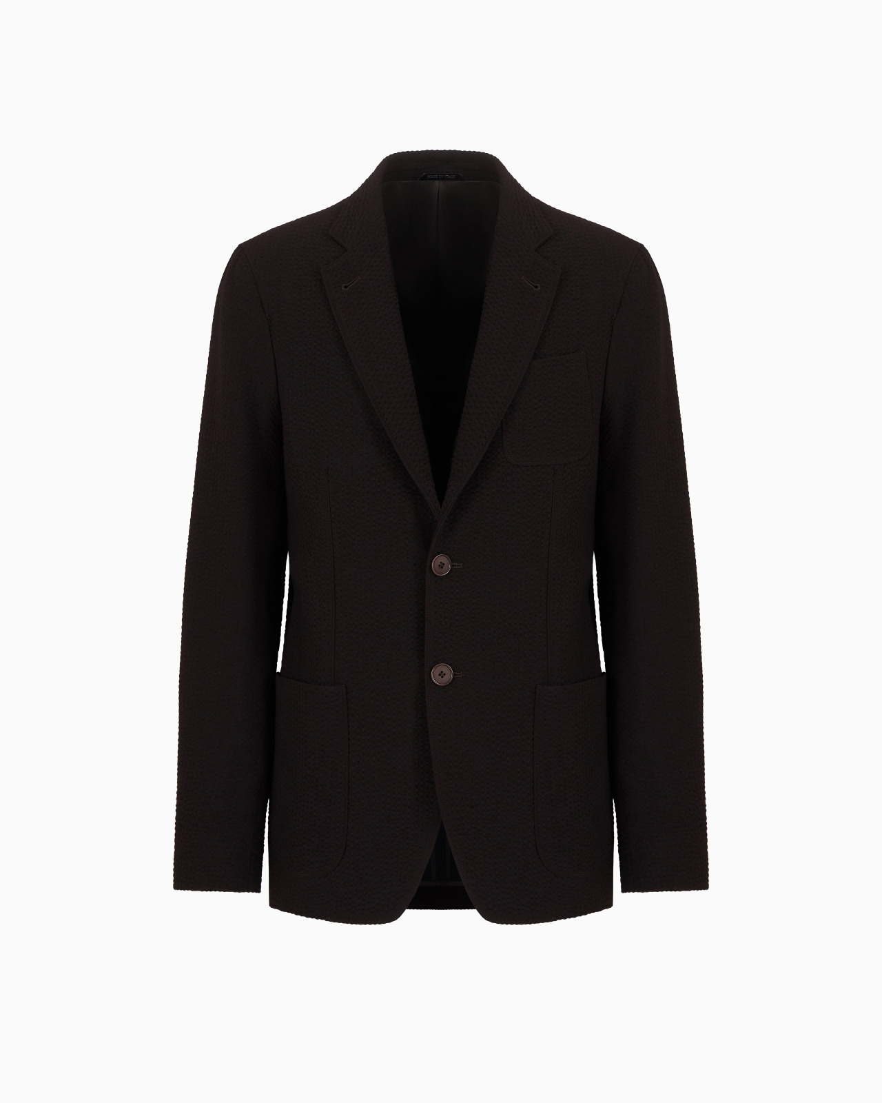 Single-breasted jacket from the Upton line with a streamlined, completely deconstructed fit: a characteristic that gives the style the iconic fluid lines that are so representative of Giorgio Armani style. This two-button style is made from virgin wool and cashmere in a distinctive seersucker weave, and features notched lapels, patch pockets and a breast pocket. Product Code: GM000140TE112001U8137 Details Composition 91% Virgin Wool 8% Cashmere 1% Elastane Upton line jacket Notched lapels Two-buttoned, single-breasted closure Two patch pockets Breast patch pocket Button cuffs Unlined Two small internal buttoned pockets Length: 73 cm Made in Italy Fitting The model is 188 cm tall and is wearing size 48 / M