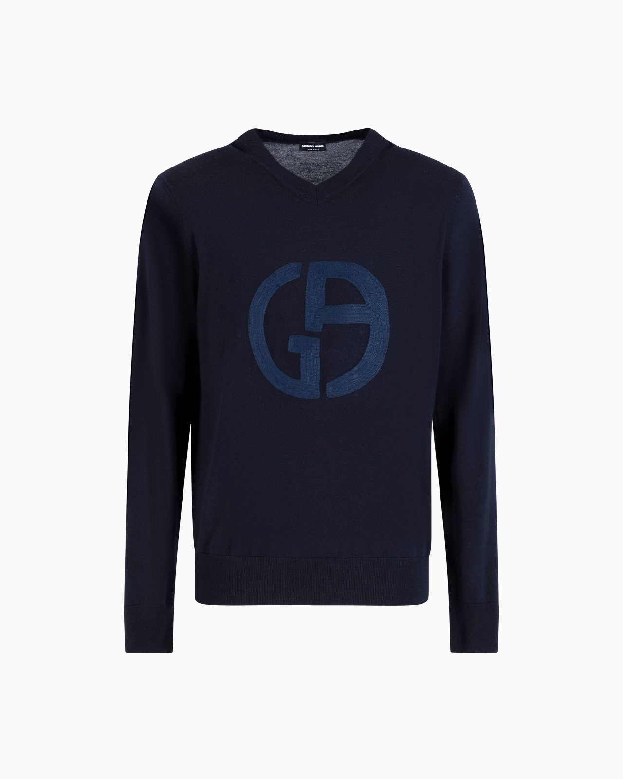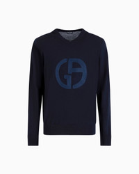 Cosy V-neck jumper made from ultra-fine virgin wool in a deep blue. The style features a customised toning GA logo embroidered on the chest. A versatile, comfortable piece, the ideal complement to laid-back looks. Fineness: 18 V neck Long sleeves GA logo with tonal Cornely embroidery Made in Italy Product Code: GM001313AF15228UB102