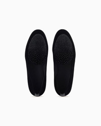 Elegant loafers made from the collection’s velvet embellished with a black rhinestone motif applied on the vamp. A sophisticated item expressed with a modern touch, perfect for wearing with evening looks and on special occasions. <br>The shoe is part of the exclusive collection that celebrates the connection between Giorgio Armani and the world of Hollywood. A colour palette of deep blues combines with a profound and ever-elegant black, to create a sparkling, luxurious selection inspired by the limelight and most exclusive Hollywood parties. Extremely sophisticated pieces with iconic lines are made of velvets, silks and satins enlivened by crystal and rhinestone embellishments and refined workmanship. Looks for him and her, designed for evenings and special occasions. Velvet loafers Black rhinestones applied on the vamp Leather insoles Leather soles Made in Italy Product Code: X2A405XR406A083