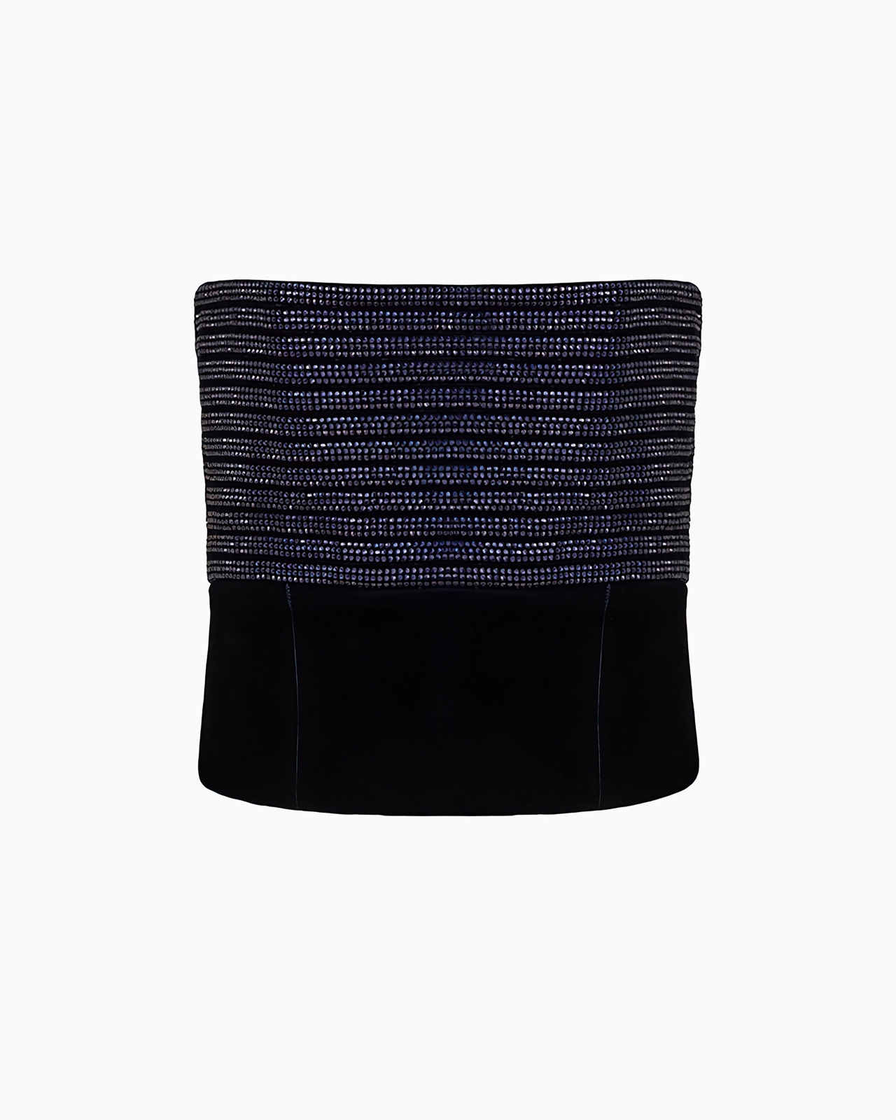 Exquisite, sophisticated bustier top made of velvet, with practical removable shoulder straps. The style is illuminated by heat-sealed blue and indigo rhinestones that create a horizontal motif and is embellished with a monochromatic embroidered motif that creates a quilted effect. A garment, closed with an invisible zip on the side, designed to brighten evening looks. Product Code: 2WHCK01NT03SY1PZ01 Details Composition 80% Viscose 20% Silk Horizontal-striped heat-sealed rhinestone embroidery detail Light padding creates a quilted effect under the embroidery Side zip closure Lined Removable shoulder straps Made in Italy