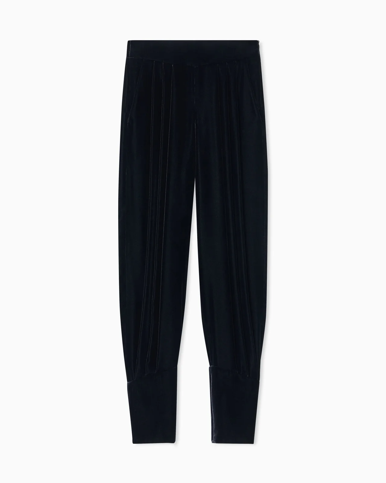Elegant trousers made from velvet, the brand’s iconic fabric known for its ability to catch the light. The style features front darts that start at the contoured waistband, creating draped volumes and fluid movement along the leg. The item’s silhouette features a line that gets slightly narrower towards the hem, ending in an ankle cuff with a concealed zip fastening. Perfect for interpreting sophisticated, modern looks. Darted trousers Smooth, contoured waistband Side zip closure Two side pockets Ankle cuff detail with zip Unlined Made in Italy Product Code: GW001601TE10831UC001