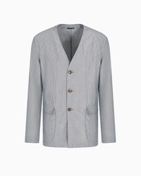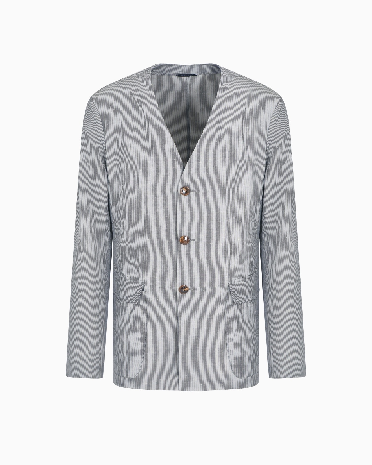 Distinctive single-breasted jacket made of viscose and linen and enlivened by a two-tone vertical striped motif. The style features a lapel-free V neckline, flap patch pockets and adjustable straps with metal rings, a stylistic yet functional detail. An offering with a modern style, perfect for pairing with the matching trousers to create a current, on-trend business suit. Single-breasted jacket V neck Three-buttoned, single-breasted closure Two patch pockets with flap Buttoned cuffs Adjustment strap detail on the sides Two back vents Length: 77 cm Made in Italy Product Code: GM001386TE14435M8153