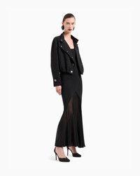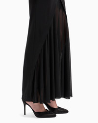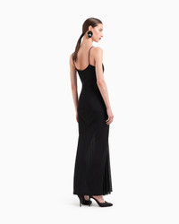 Long dress with clean lines and a slinky fit that elegantly outlines the feminine silhouette. Made of viscose jersey interlock, it features pleats at the hem that create movement. A sophisticated offering, perfect for wearing with bright jewellery to complete evening looks.<br>The garment is part of the Holiday selection, which plays with a minimalist colour palette of black and white, colours that have always been a symbol of sophistication. A colour choice found in the fabrics, embroideries and accessories that express the essence of Armani spirit, distinguished by clean, androgynous-inspired lines, that are still always feminine and sensual. Thin shoulder straps Rounded neckline Skirt with draped pleats on the front Length: 105 cm from the waist Made in Italy Product Code: GW001829AF14712UC001