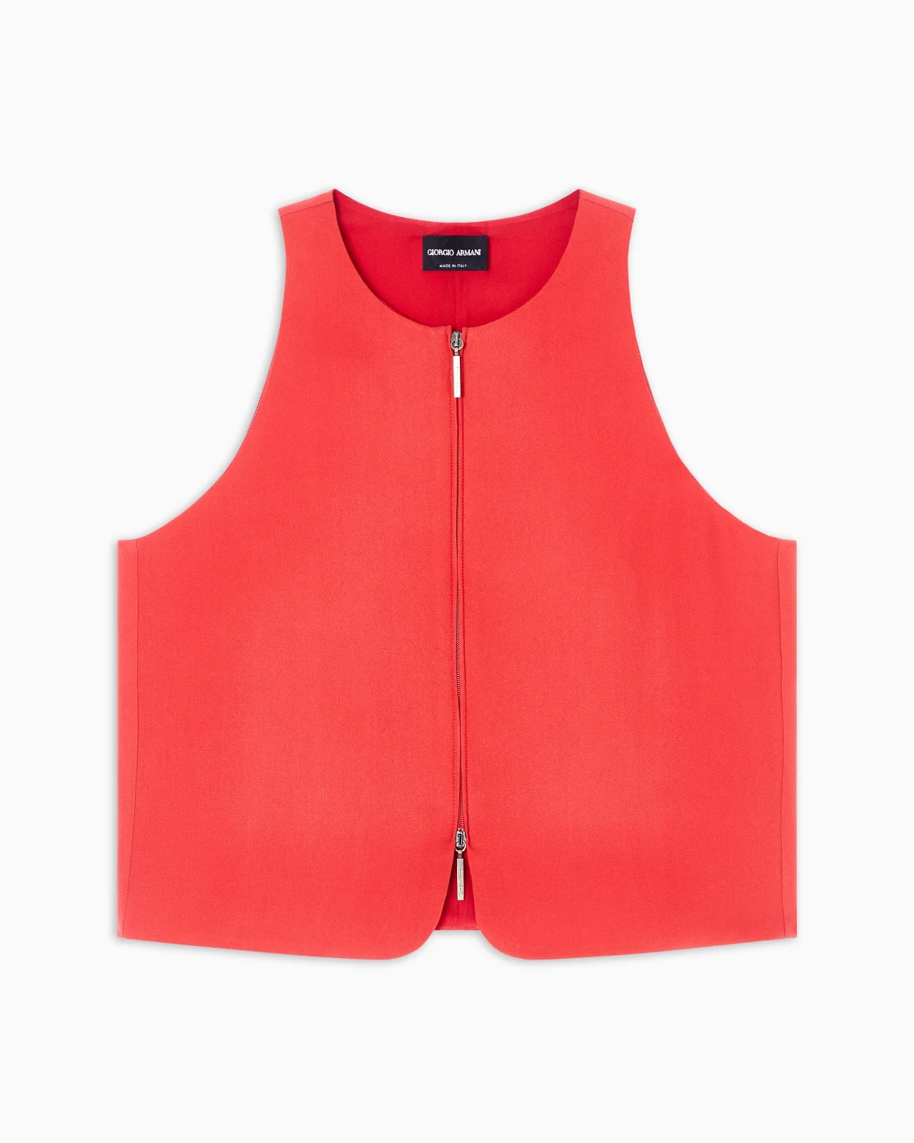 Washed silk crepe waistcoat, featuring a practical double-pull zip fastening. Highly versatile, it adds a sophisticated touch to a wide array of looks. The piece is part of the Holiday selection, which ranges from warmer to cooler tones with shades of coral red and grey, colours that create a refined, evergreen palette. The collection offers fluid shapes and smooth fabrics for a touch of modernity that never compromises on classic elegance. Crew neck Front zip closure Lined Made in Italy Product Code: GW003007TE20007U5005