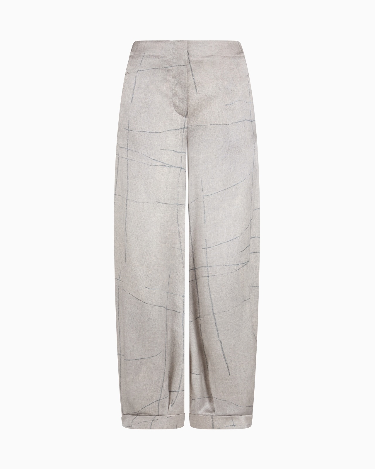 Relaxed, wide volumes for these distinctive silk satin trousers enlivened by an irregular striped print. The style, with a smooth waistband, side pockets and stitched turn-ups, can be coordinated with the matching shirt to create a total look that is both casual and chic. Smooth waistband Hook and button closure Two side pockets Shaped and stitched turn-ups Made in Italy Product Code: GW000642TE13743F8078