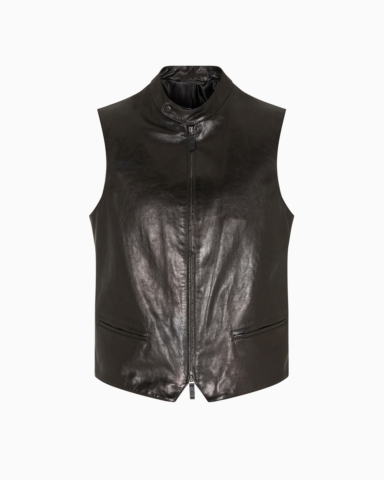Gilet in nappa calfskin with a glossy plonge tanning, a premium leather with unique characteristics. The style features a one-button stand collar, front zip closure with double pull tab, and double-welt front pockets. A minimalist design with a refined choice of material, adding character to various looks. Stand collar with press-stud closure Front zip closure with double pull tabs Two double welt pockets Lined Length: 60 cm Made in Italy Product Code: GM002237AF20392UC001