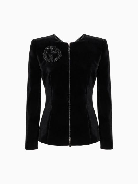 VELVET ZIP-UP JACKET WITH BOW DETAIL AND EMBROIDERY