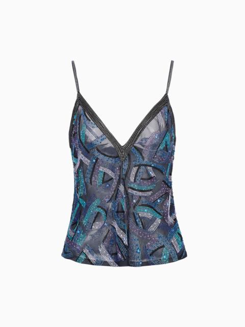 Long single-breasted jacket in silk and tulle with rhinestone embroidery