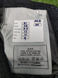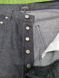 A.P.C Denim Tunisian jewish fashion design by Jean Touitou in Paris.Bootleg model tag size 31 made in Tunisia.Manual waist 31' and outseam length 39'(please refer measurement box for detail).Material 100% cotton very good gently used condition.5 button PAYMENT: 🏦PAYPAL ONLY *REFER PIC FOR PERFECT PURCHASE SHIPPING POLICIES: ✈️✈️INTERNATIONAL SHIPPING BY DHL(EXPRESS) *Pls leave ur phone number for complete shipping 5-9 DAYS US/EUROPE( SHIPPING COST 25-40$) PLS CONFIRM YOUR MANUAL FIT FROM MEASUREMENT BOX ❌ RETURN FOR WRONG SIZE WRONG COLOUR.DONT LOSS MY SHIP COST THANKS FOR SUPPORT ME.FOLLOW MY GRAILED FOR MORE ITEM ✅REASONABLE OFFER ✅RECEIVED FOR ASK ANY QUESTION ***(ATTENTION) All item direct from used clothing Japan Market not washed or exposed to water. Please make sure you wash first before use to soften the fabric.