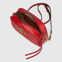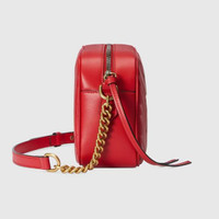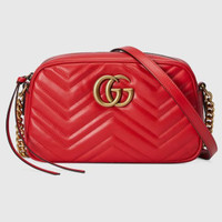 AUTHENTIC AND GENUINE GUCCI PRODUCT - RFID CHIP STYLE 447632 AABZB 6832 Crafted from red matelassé leather, this small GG Marmont chain shoulder bag has a softly structured shape and a zip top closure with the Double G hardware. The chain shoulder strap has a leather shoulder detail. Red matelassé chevron leather Antique gold-toned hardware Microfiber lining with a suede-like finish Double G Interior open pocket Adjustable chain shoulder strap with 23.6" drop. Can also be worn as a crossbody bag. Zip closure Weight: .85lbs approximately Small size: 9.5"W x 5"H x 3"D Made in Italy