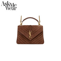 AUTHENTIC AND GENUINE SAINT LAURENT PRODUCT - RFID CHIP Introducing the Medium College in Quilted Suede: an iconic bag with Chevron quilt stitching and a metal Cassandre logo. It's compact, functional, and versatile with a detachable swivel hook chain strap. Featuring a cotton lining, light bronze brass hardware, and an interior zipped pocket. Dimensions: 9.4 x 6.6 x 2.5 inches. Made In Italy