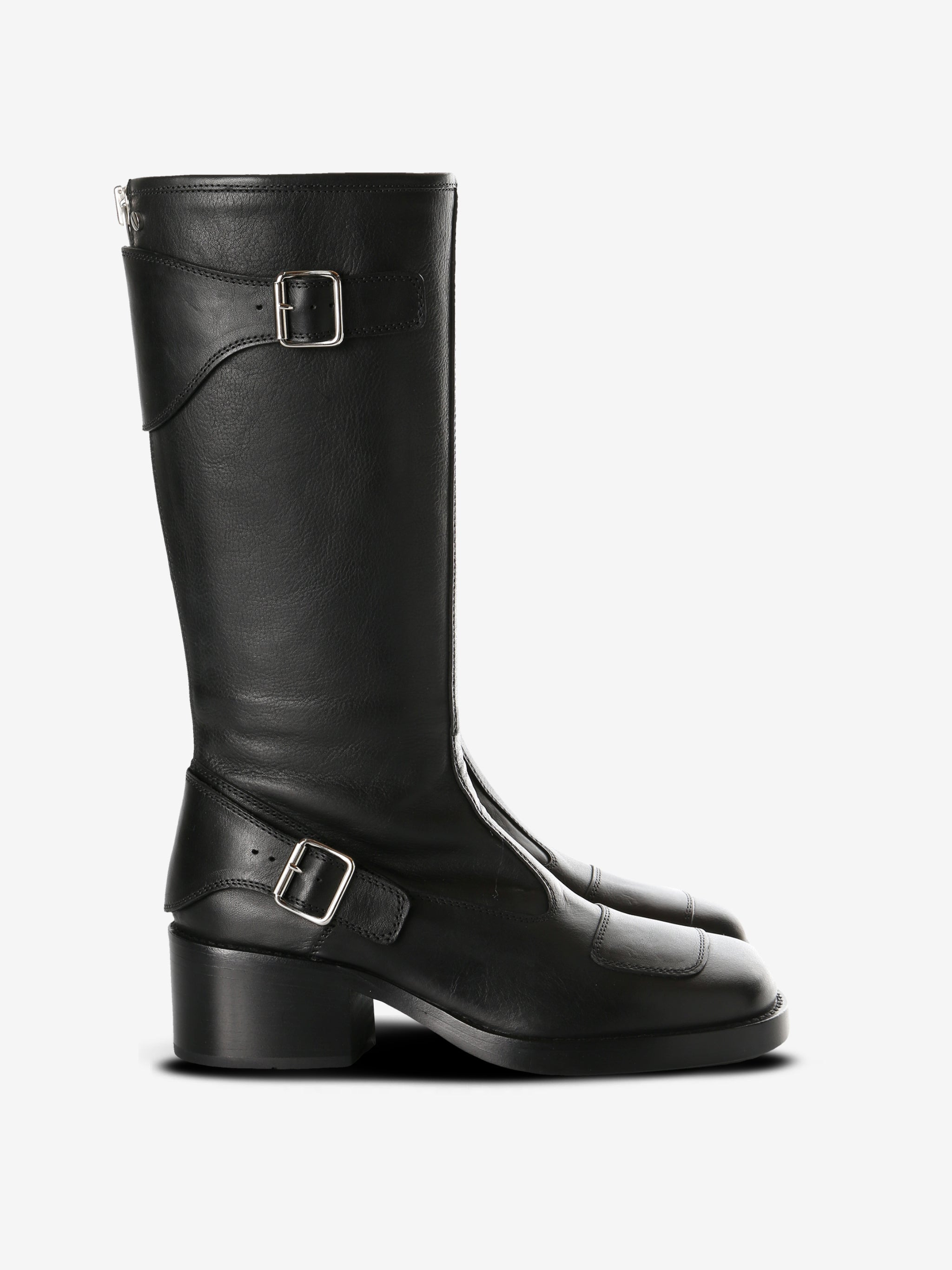 High silhouette Smooth calf leather construction Rear full-length Silver zipper closure Adjustable buckle straps at ankle Adjustable buckle straps at upper shaft paneled Design with tonal stitching 100% Calf Leather Made in Italy Style: 2502 W C01 LT177 099