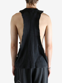 Refined urban edge Balenciaga distressed top Menswear collection highlight Sumptuous cotton knit Sleek black tank top Wide arm openings Elongated silhouette Artfully exposed back 100% Cotton Made in italy Style: 850268 TTVC9 1041